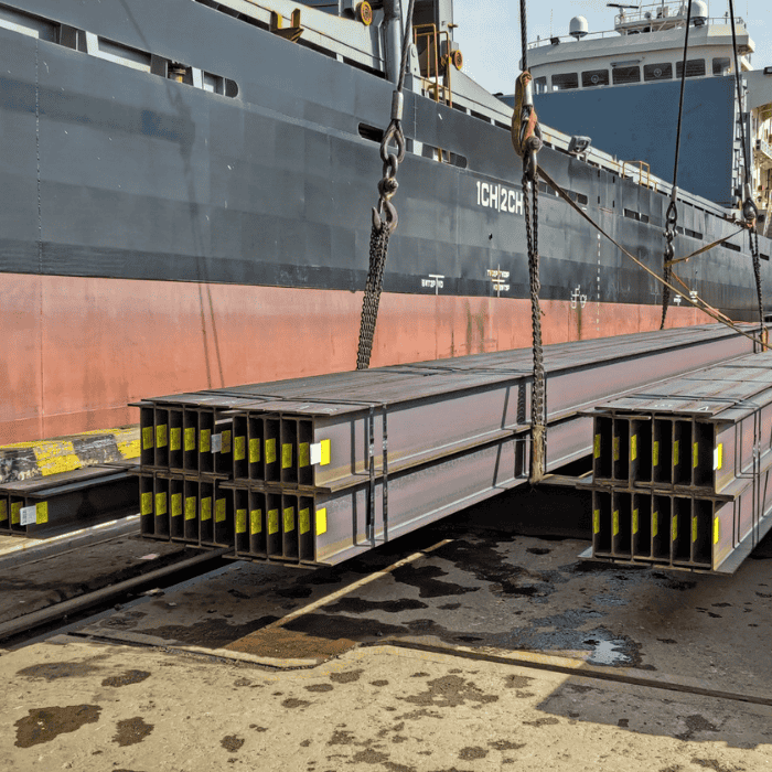 Hình: Cẩu và chằng buộc dầm thép phục vụ xếp dỡ hàng hóa tại cảng biển